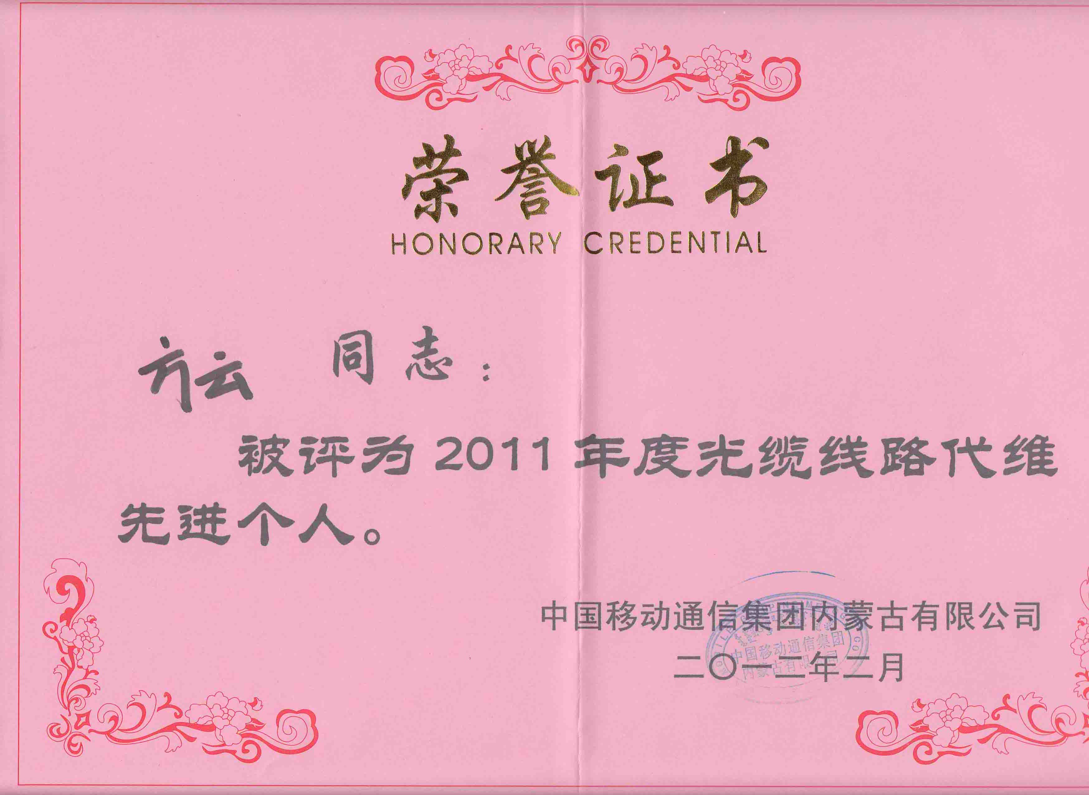 2011年度光纜線路代維先進(jìn)個(gè)人評(píng)選結(jié)果揭曉—運(yùn)維部副經(jīng)理方云同志,被中國(guó)移動(dòng)通信集團(tuán)內(nèi)蒙古公司評(píng)為“2011年度光纜線路代維先進(jìn)個(gè)人”。